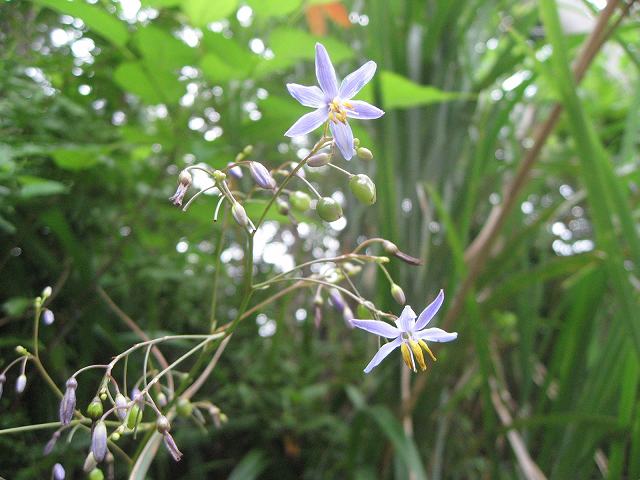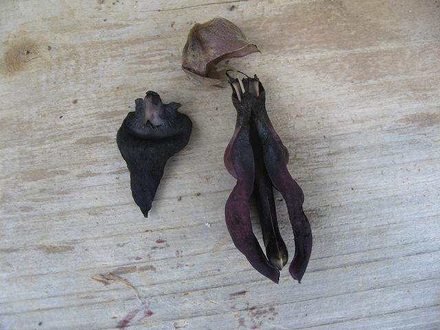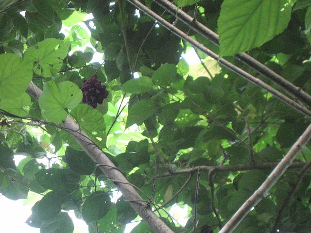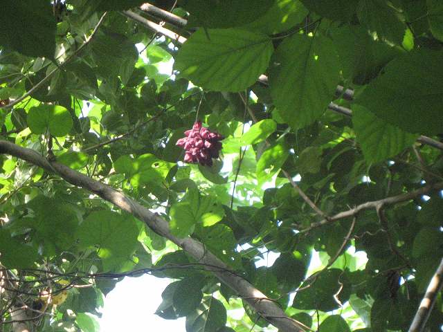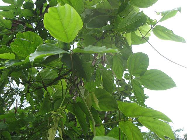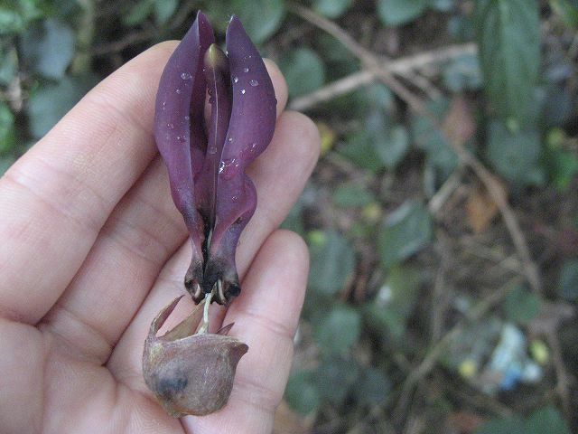 森で作業している最中、何気なくふと、見上げました。 『カショウクズマメの花だ!!!』 思わず、叫ぶ。 一緒に作業しているみなさん、 私の声にビックリしつつ、 みんなで見上げました。 『へぇ~。カショウクズマメっていうんですか・・。』 『ハイ。そうなんです。マメなんです。』 『私、マメ好きなもんで。』 アルバイト中に、恐縮しながら 写真を撮らせていただく私。 ちょっと、慌てちゃって綺麗に撮れませんでした。 花は周囲にいくつかさがっていました。 その後の作業中も、メンバーの一人の大学の先生は、ニコニコしながら 私に釣られて時々上を見上げていました。。