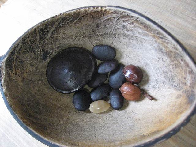 糸の準備。 綿と麻と。いっぱい巻きました。 なにができるかは・・・ まだ秘密。 結構な長い時間、ガラガラ・・と 糸巻きの音がしています。 本当は座繰り(お蚕さんから生糸を引き出す)の道具なのだけれど、 木工の師匠が、管巻きもできるようにパーツを作ってくれたのです。 道具のほとんどは中古を探して修理するか、 師匠に作ってもらったり、島の大工のおじいに 作ってもらったり。 だいぶん揃ってきました。 ちょっと疲れてきたら・・・ 海豆眺めたり、触ったり・・。 これは台風の前日に見つけたコたち。 ココナッツの器も海で拾った。 今日は、一日曇りでした。 この秋になって、初めて、半袖じゃない日でした。