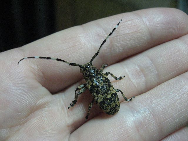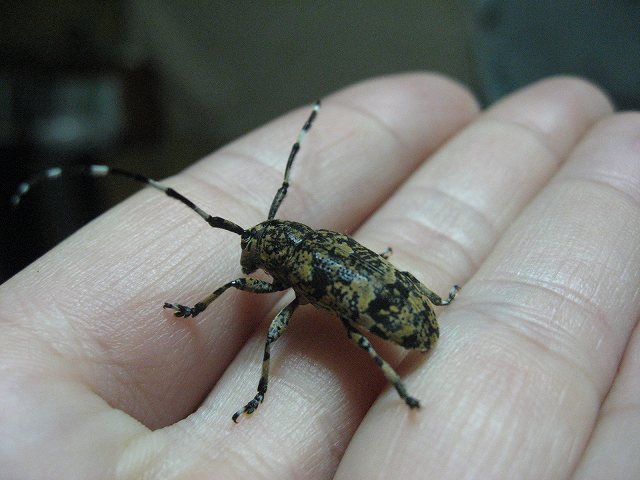ま、色んな意味を込めてだけれど。(綿に発生している虫も然り・・。) 我が家は、網戸なんてものはございません。 しかも、2階建ての2階の部屋。 煌々と灯りを灯しているのだから、虫たちは私の部屋の蛍光灯を目掛けて 飛んできますわな、そりゃ。 羽アリやら、カメムシやら、カミキリムシやら、 カナブンやら、ゴキブリやら、カナブンやら、カナブンやら・・・ 羽アリはすさまじい集団攻撃なので、いち早く飛んでくる気配を察知して、 ほとぼり冷めるまで灯りを落としてしまします。 ゴキブリさんはさすがに、申し訳ございませんが、 見逃すことなく、即、抹殺してしまいます・・・。 カナブンは・・・哀愁漂うカナブンさんは、灯りの周りを何度もぐるぐる周っては、 ひっくり返って起き上がれないままの状態でブンブン羽音だけ鳴いているのもせつないので、キャッチしましたら、速球?でお外へ・・・。 最近、カミキリムシがもっぱらのお気に入りなんです。 以前も記事にしましたが、なんかかわいいコがいるんですよ。 愛くるしい・・と、でも言いますか・・・。 先日、深夜に台所の窓ガラスにいたんです。 ありゃま。かわいかね・・。 ちょっとだけ。ごめん、ごめん。 灯りの下まで連れてきて、撮影会しちゃいました。 ウフフ・・。かわいいとよ・・。 ほら。きれいなコでしょ。 ハイ。よくできました~。 カワイイこのコはね、『 ワタシ、『サビカミキリ』系が好きらしいです。 名前もよかですね。 鉄のサビも好きだし、 これから人生「わび・さび」のココロを大切にしたいと思っていたところだし。。。 エヘへ。 いやあ。このコたちの模様や体と触覚のバランスなんて、ホントに絶妙。 ホント、宝だなぁ・・・と、思いながら夜を更かしたのでした・・・。