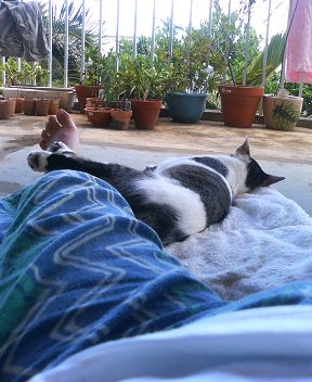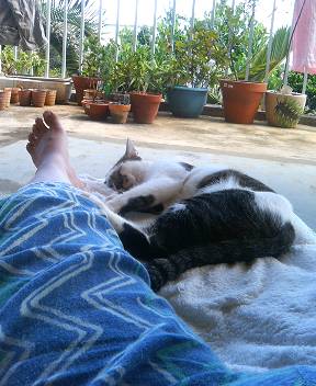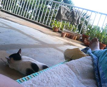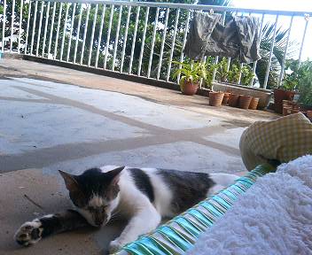 こんなにもサボっているのに、マメにお越しいただいてたみなさん、本当にゴメンナサイ。 そろそろ、わたくし復活します!! 真夏の復活第一弾! 気合を入れなおしていくじょ!! なんて言っておきながらの・・・ これ。 ハイ。親子でだれてます。 夏バテ気味です。 今日もあちぃね。あくびぃ~・・・。 『ボク、暑いけど、お母さんが好き。』 『うん。お母さんも暑いけれど、あくびが大好き。』 クーラーなんかなくても、ボクたちシアワセだよ。 室内がサウナのようになっているので、ときどきベランダで涼んでおります。 お日様が顔を出して間もない朝。 ただ部屋で寝ていただけなはずなのに、ぐったり・・・。 我が家は夜中になっても部屋の中が30℃超えてます。 でもね・・・。 やっぱり、くっつきすぎはあちぃニャ。 ハニャ・・。 お母さん、あちぃよぉ・・・。