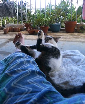 普段はとても臆病で日中は特に家に篭っていて、あまりお出かけもしないコなんです。 夜は、パトロールがあるのかお出かけはしますが、ちゃんと帰ってきて 朝目覚めると、私の横でお腹見せて寝ています。 近所の気が強いネコたちにいじめられがちなあくびは、 基本的におうちで母と遊んでるのが好きなコなんです。 が、しかし。2、3ヶ月に1~2日間程、帰ってこないことがあるんです。 ひどく汚れて帰ってきたこともあれば、よそのおうちのニオイ(蚊取り線香とか、トイレの芳香剤のニオイ)を体につけて帰ってきたことも。 だけど、今回はなんだか嫌な予感というのか・・ここ最近、私は集落の行事などで忙しくて、帰りも遅いし、あくびとゆっくり遊ぶ暇もなくしていたのもあって、なんだか嫌な胸騒ぎが・・・。 それに追い討ちをかけるかのように、お隣さんが、数日前に家の前で車の急ブレーキと共にネコのギャーッという悲鳴を聞いたと教えてくれたもんだから・・・もう、気が狂いそうに不安で。 行方不明から3日目の月曜日、私の不安は最高潮。 近所を探し回って、逢う人に尋ねたり、動物病院のせんせーに電話をして、 怪我をしたネコが運ばれて来ていないか?聞いたり・・・。 ネットで、『ネコ 交通事故』などと検索してみたり・・。 本当に、今までになく不安で気が遠くなりそうになったり、 そうかと思ったら、楽観的になったりして、情緒不安定な人になりました・・・。 ご飯も喉を通らず、夜まで何も口にしなかったと思えば、 急に『こんなことで私が弱っては、あくびにも良くない』と、思って山盛りのパスタを拵えたり。 そんなこんなで、深夜になっても帰ってこないので、揺れるココロの中でも覚悟もしました。 怪我をして、どこかに隠れてそのまま動けなくなっているかもしれない。 『お母さん、助けて!』と、呼んでいるのに、忙しくしてて気がつかなかったのかもしれない。 あくびは、息絶えていたら、きっと見つけられないような所にいるだろう・・・。 無残な姿を母に見せたくはないだろう・・。 そうだったら、私はあくびを探さないほうがいいのかな? そんなことまで考えて、ベランダから星を見上げていました。 『あくび・・強いコ。タフなコ。元気なコ。頑張って帰っておいで。』と念じてみたら、急に涙がほっぺを走りました。 『あくび!大好きなあくびぃぃ~~!!』思わず声に出しました。 それから、数時間後・・・。 部屋の中でしょんぼり一人、抜け殻となってボーっとしていたら・・・。 『ニャニャァ~~』と呼ぶ声がっ! 午前3時を少し前にしたころ。まるっきり無傷で御帰宅。 いつもより少し多めの缶詰をガツガツと平らげて、思いっきりまつわりついて 甘えまくり~の、じゃれまくり~の。。。 ただ今、白目剥いて寝ております・・・。 皆様、お騒がせ致しまして、申し訳ございませんでした・・。 ちゃん・ちゃん♪