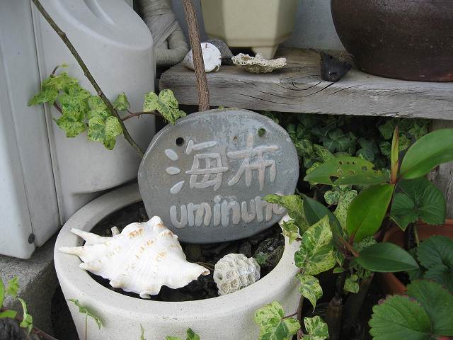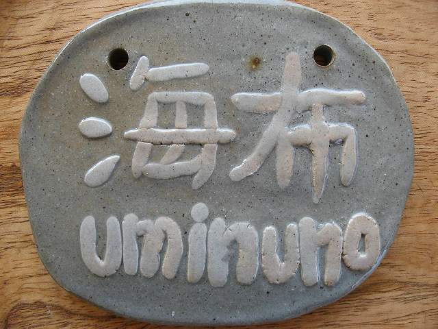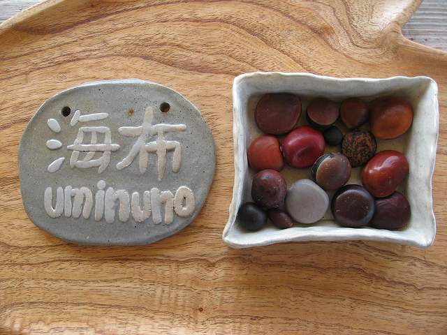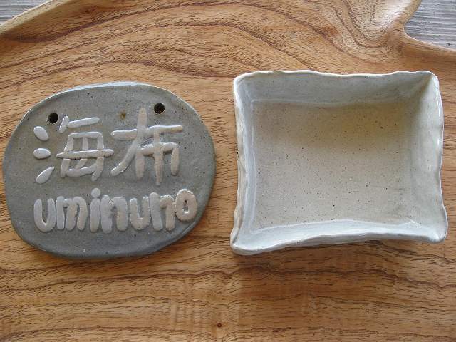 そういえば、先日の体験陶芸で作った「海布」看板と、お皿。