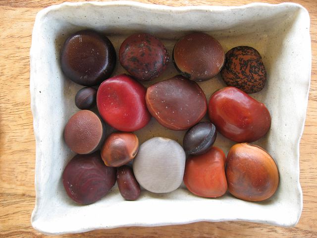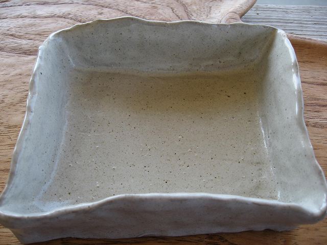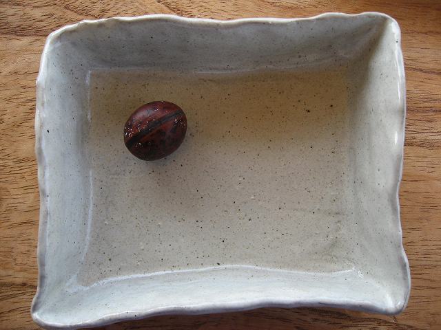焼きあがりました。 こんな感じになりました。 看板、思ったよりいい感じだな。 うっすら、ピンク色がふわふわっと入っていい感じ。 偶然のできあがりです。 そして、もうひとつ。 四角なお皿。 ほほう~~・・・。 こんな展開ですか~。 ん??よくよく考えたら・・ アレ?焼きしめで仕上がりの予定だったような・・。 間違えて釉薬かけちゃったかな? ま、これはこれで。 「豆」も映えてよしとします。 いっぱい入るとこんな感じ。 いやぁ~。カワイイなぁ・・。海豆って。 (エ?ソッチ?) ウフフフ・・・。 うれしいにゃ。 オマケ・・・。 試しに・・・機織り小屋の玄関にて。