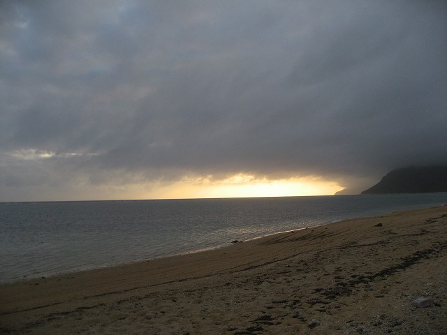 南の方へ向かう途中、まだ怖さを知らない、可愛い子ヤギの兄弟が寄って来て。 この場所は、どんな天気の時でも私の目に美しくて、いつ来ても心が静まる海です。 この浜は、自生のハスノハギリやハカマカズラ、カショウクズマメがいつも待っていてくれます。 いつもよりハカマカズラが多めなのは、やや珍しいかな。莢も流れてきていました。 今まで気がつかなかったのだけれど、浜の入口にはワニグチモダマの蔓が這っていました。 このコは、ちょいと長旅して来た様子です。 みんな、元気だよね。。 心地よくポケットに収まって、みんなのアパートメント。 思いを馳せるは、ずっと繋がっている海。どんなに遠くても繋がっているんだね。 豊かな恵みを育んでいる。モズクももう寄せてきているよ。 雲が重たく包みこんだ空の下、 静かな海辺の平常心は、とても心強いエネルギーとなりました。 ふと振り返ると、雲の切れ間に 燃える日の終わり。 今日も一日をありがとう。
