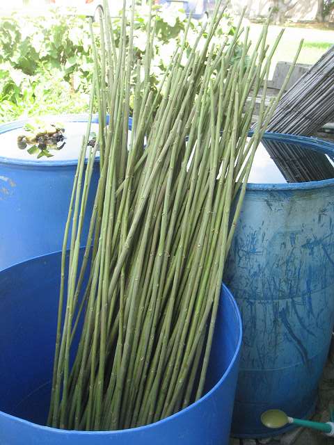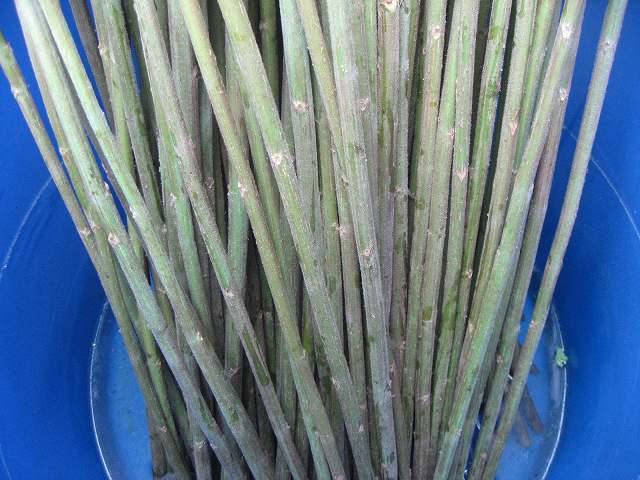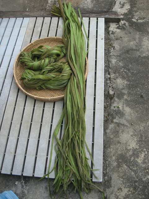 そういえば、3月のある日に島の方からとても立派な苧麻を譲っていただいたのでした。 葉を落とした状態で 持ってきてくださいました。 とっても大事に育てられて、 とっても長~い。 こんなに長い苧麻は 初めて触りました。 太さもとても立派。 茎の芯と皮をはずした状態です。 これを水に浸して、鍛冶屋さんに作ってもらった刃物のような専用の道具で繊維を採ります。 苧麻(ちょま)は、島の言葉では「ブー」と言います。 このブーの繊維で糸を紡ぐことを 「ブーを績む(うむ)」と言います。 昔から、視力が落ちてきたりして機織り機から下りた高齢の方々がブー績みをして上質な糸を作って上布用等に販売しておられたようです。 現在は後継者が少ないそうですが、 島では今も織り子は小さな畑で 少しずつ自分が織る分だけ育てては コツコツと糸を績んでいます。 糸紡ぎの様子は、また改めて御紹介します。