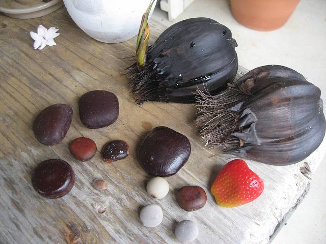 いつのまにやら霜月です。はたまた御無沙汰でございます。 ネタは貯まりつつありますです。 これから、ナガレモノな季節でございますよ・・。 先回の記事にて、『月に一日はじっくり海を歩いて・・記録を・・云々・・』と書きました。 ハイ。やってきたのです。月一豆捜索! そこまでは、時間さえ作ればなんてことなくできるんですけれど。 『記録』と『更新』が。。。不精極まりないのですが・・・ひじょーに、面倒であります。 特に、後者の方が面倒で仕方が無いのです。 しかぁし!言ったからにはやるしかないのでありまして、頑張ろうと思う所存であります。 目指せ!豆探して豆に更新!(月一って自分で思いっきりハードル下げているのにね・・) なので、今回はその他諸々は後回しにして、月一豆の御報告です。 久しぶりに降りるビーチ。 賑やかな足跡がたくさん! ブヒブヒ一家でご飯探しにきたのかな~。 最近、どうも、流行っているらしい・・・。 冬瓜茶!! ペットボトルのもよく見かけています。 ど、どげんやろうか・・? お姉さん・・。 いたいた! 最新のタイドラインで待っていたよ。 とにかく、海藻とゴミがすんごく多いのです。 きっと、この海藻の山の下にも海豆ちゃんがいるんだろうなぁ・・とは、思いますが、 さすがに除けてまで探せません。 (たまに気まぐれで蹴ってみたら、偶然ちょうどジオクレアちゃんがいてくれた事はありますよ!) ここの浜では、このふたり。 ふとっちょ赤モダマさん。 ローカルドリフトらしき、 とっても美しいヒメモダマさん。 それから、 裏も表もかわいい陶片。 そして・・・。 しかも、私3個目です。 エボシガイも生々しく付着していて、長旅してたのかな? と、思ったけれど、意外と最近の様子。 今年の夏に落とされたようです。 ハウジングは結構ボロボロですが、 中身は大丈夫でした。 この件は、また後日詳しく。 持ち主探しするとしましょう。 次の浜へと。 この浜も海藻のラインができていました。 防潮林の根元からたくさん砂が流れて、 一緒にゴミも出てきていました。 ゴミの割りにあまりめぼしい物は見当たらず・・。 諦めかけたころに、何気に掘った砂から 出てきたのは! ハンバーガー君じゃないか! ここでも、海豆ちゃんはふたつのみ。 ハンバーガー君は、かなり久々で嬉しい。 ハスノミさんらしきコも。 付着物はほとんど無し。 ここのビーチはマングローブもたくさんあります。 これは、チビッコオヒルギ。 た~くさん落ちていて、ついつい拾ってきちゃうのだ。 チビッコでも、過保護に育ててたらたまに芽吹きします。 復路の途中で、ふと思いついて車を停めると。 そこは、カショウクズマメの自生地。 莢を捜して見上げてみたけれど・・。 フム。高い木の頂上に蔓は這っているので、見えないな。 地面を探すと・・ いましたよ。山豆カショウクズさん2豆ゲット。 最後に立ち寄ったビーチで、思わぬ出会いが! めったに降りない小さなビーチ。 降り口も草ボーボー。アダンがイテテテ。 林をくぐり抜けた瞬間に目に飛び込むは、 ピンクゥ~!! そうです。ピンクモダマちゃんでした。 やっぱり。うれしか・・。 ピンクちゃんのすぐ横には、 長旅してきた様子のタカナタマメさんもいました。 ウヒヒ。 しかし・・・。 なんだか、豆、少ないな。 ライバル多いのか?不作なのか? (島の豆先輩曰く、圧倒的に結実が減っているとか・・。 モダマやハスノミ、カショウクズも例年より少ない気はします。) オマケ: ちなみに、この日のとっておき、ハンバーガー君とピンクモダマちゃん。 顔を洗う前と、綺麗になってからの2ショットです。
