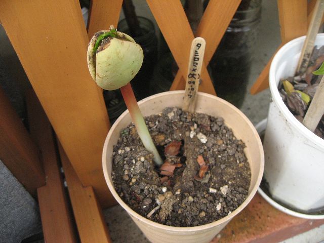 ある朝。 お庭のポットから顔を出したのは・・・。 うぎゃーーっ@*#%$!! ダダダダ大蛇??おろち?? いいえ。タシロさんです。 海からやってきたタシロマメ。 勢いよく、お誕生でございました。 国産は絶滅が心配されているようです。 この種子は、大きさからおそらく海外産でしょう。 島では、昔からシロアリに強い材として 活用されてきたそうです。