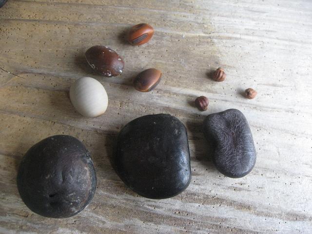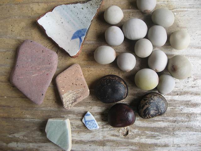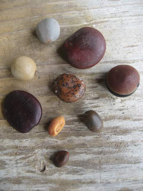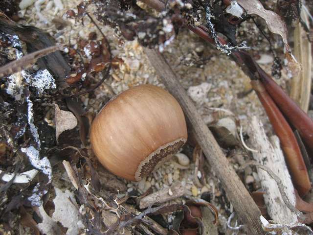 画像もいっぱいいっぱいで、いつがどこやら。。。 月の終わりに慌てて歩いた、 月一豆捜索の御報告と共に 思い返してみるとします。 10月の終わりのある日。 一枚目は、豆ではなくて実ですね。 海岸沿いの岩の崖下に落ちていた種子。何の実かな? 二枚目は、ハカマカズラ。島に自生しています。 小さくて可愛い豆ですが、あまり海豆では見かけません。 海岸林に多いけれど、カショウクズ同様、水に浮きにくいのかもしれません。 バイトの合間に出会ったコかな。 ワニグチさんは、やはりよく会いますね。 カショウクズさんより自生は少ないはずですが、海外からなのでしょうね。 こちらは、前回の記事の漂着ライター調査の日程のある日の収穫です。 ホウガンヒルギ(画像左の実)がヤドカリ達に 食べられず完品なのは、結構珍しいです。 引越しをしてから、とても遠くなってしまいなかなか足を運べずにいましたが、近くまで仕事で行った日に歩いてきました。 ここは、ハスノミカズラとカショウクズマメの ローカルドリフトが多い浜です。 そして、またまたついついの陶片。。。 それぞれが個性がありますね。 まだら模様の黒が密集していたり、 無地でピカピカな光沢だったり。 しかし、やっぱり例年より打ち上げの数が 少ない気がします。 ハスノミカズラも然り。往復するだけで 両手からこぼれる程拾っていたのにな・・・。 さて。先月から始めました、月一豆捜索隊。 これはあまり深い意味はないのですが、ここのところなかなかじっくりと豆探しに出かけられなかったので、せめて月に一日は海散歩を堪能しようと思ったのと、 毎月同じビーチを、端から端までくまなく探して、豆だけに限らずに気がついたことや 天候や風なども含めて記録をつけてみようと、思いたったというわけです。 普段の合間に少しだけ歩くときでも、ある程度記録はしていますが、 より綿密に記してみようかと。 10月より海藻ラインが細めです。 寄せ物は少ないのかな? なんか、おもしろいものに目が行ったりつつ。 今日もヤドカリちゃんはトコトコと おでかけですね。 なんだか、ちっともめぼしいものには会えずに、 あきらめモードに切り替わりそうになってきたところ・・・。 それは、小さな川をジャブジャブ越えてからいきなり現れたのだ! ウゲーーーーッ!!! いつもキミは、いきなり私の目の前にやってくるのね。。。(笑) 私の豆コレクションの中でも 数少ない種類です。 確か、熱帯アフリカ原産で、野生種は絶滅の心配あるとどこかで見た気がします。 3個目ゲット! いやあ。足取りも軽やかになってきております。 あらま、惜しい。ガラス玉。 復路はタイドラインよりも海側をのんびりと歩いていたら・・・ ん?(二度目視。) あ゛ーーーっ!! ハンバーガー君!! 今日着いたんだねぇぇぇ~~~。 はるばるよく来たねぇぇぇ~~~。 あらま。カワイコちゃん。 付着物はほとんど無しですよ。 案外、近い海の向こうにいるのかしらね? もう、蓮の実やら、ハスノミカズラさんやら、シロツブさんらしきコやら、 コロコロコロコロこっちを見ていましたよ。 砂から顔を出したばかりの双葉ちゃん もいました。 どんなコなんだろうな。 もう少し大きくなった頃に また会いに来てみよう。 やったね。。。 今回は、レアな海豆ちゃんが二豆。 蓮の実もたまに見つけます。 これはそのうち発芽に挑戦したいです。 お馴染み、タシロさんや、 肌色なデイゴちゃんや浜に自生している ハマナタマメもいましたよ。 このコは一度海へ旅に行ってきた様子でした。 嬉しいにゃ。